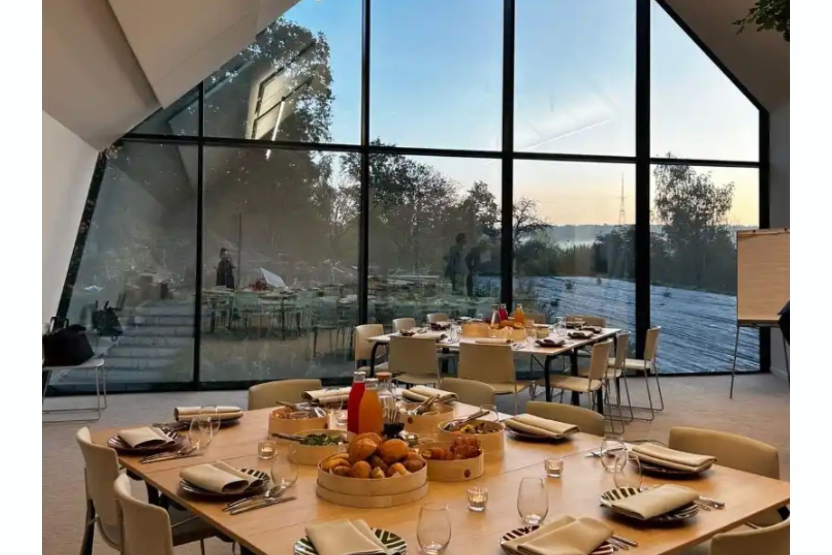La Guinguette, ouverte sur la cour, permet d’organiser un buffet, un barbecue ou un cocktail jusqu’à 75 personnes debout. Quant à La Clairière, cet espace de réunion atypique à l’orée des bois convient pour 12 participants.
